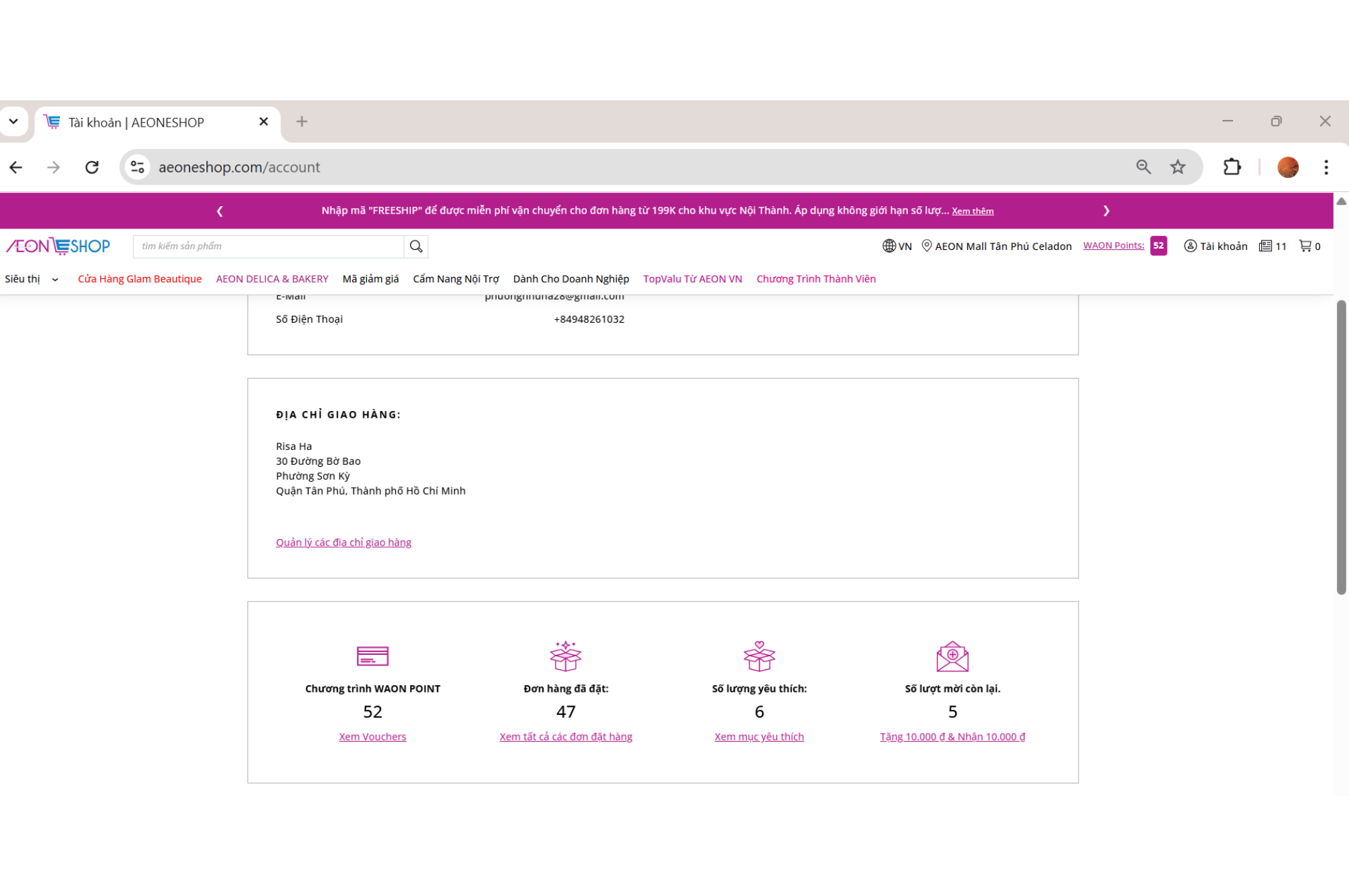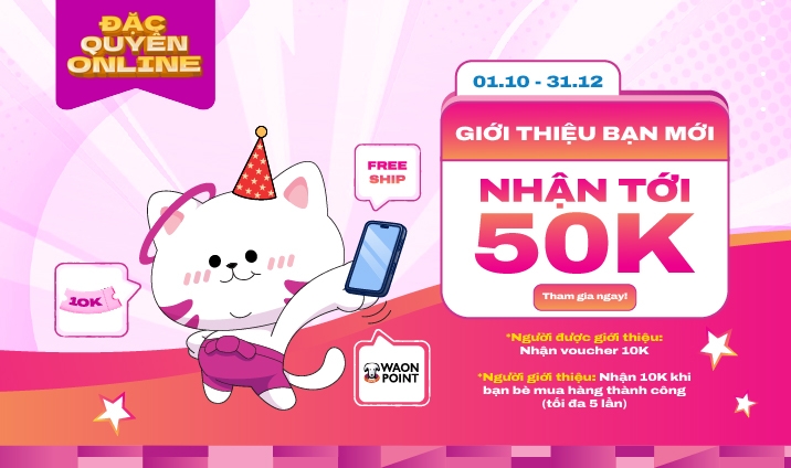 Sau khi Người Được Giới Thiệu hoàn tất đơn hàng đầu tiên, ưu đãi 10k sẽ được cộng vào tiền thưởng AEONESHOP của Người Giới Thiệu và sẽ được trừ cho lần mua hàng tiếp theo. Người Giới Thiệu có thể kiểm tra thông tin Tiền Thưởng tại "Tài Khoản" ở mục "Chỉnh Sửa Hồ Sơ"