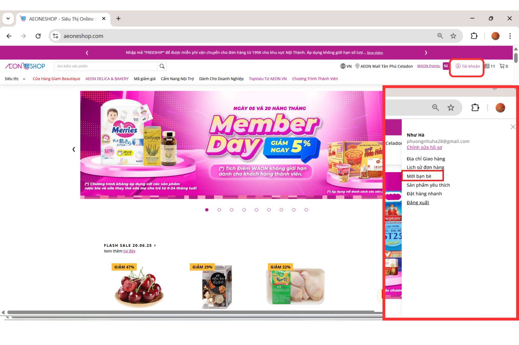 Bấm vào mục "Tài Khoản" khi Người Giới Thiệu đã có đơn hàng tại AEONESHOP. Sau đó, bấm vào mục " Mời bạn bè"