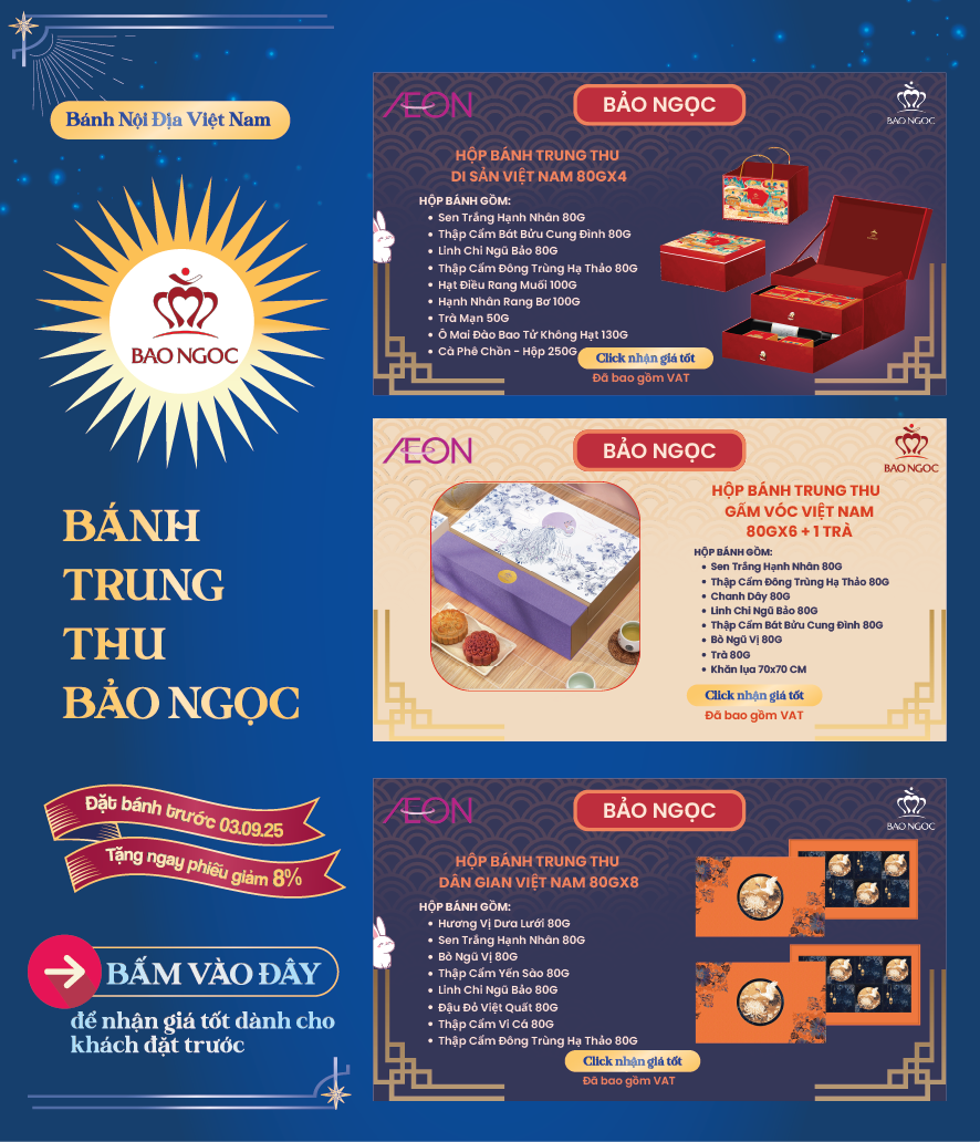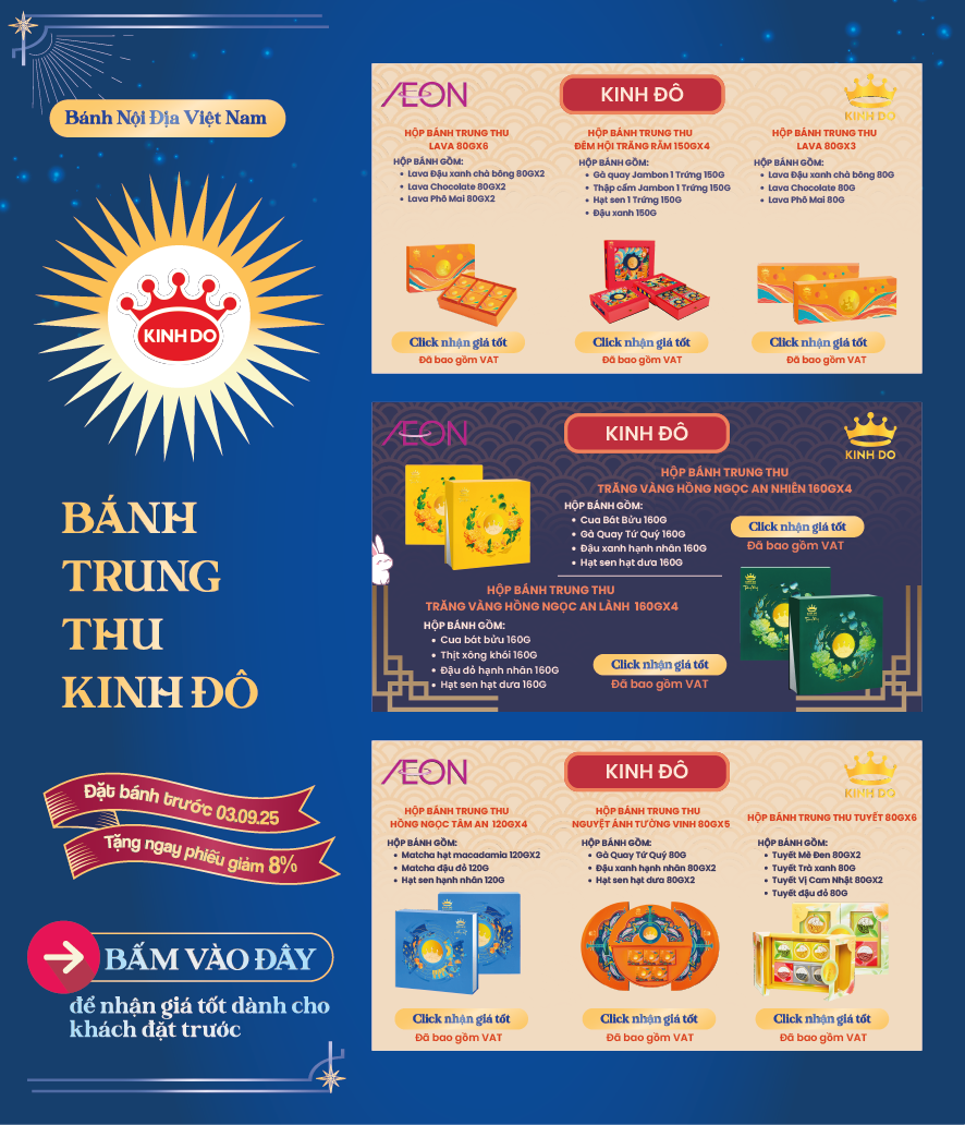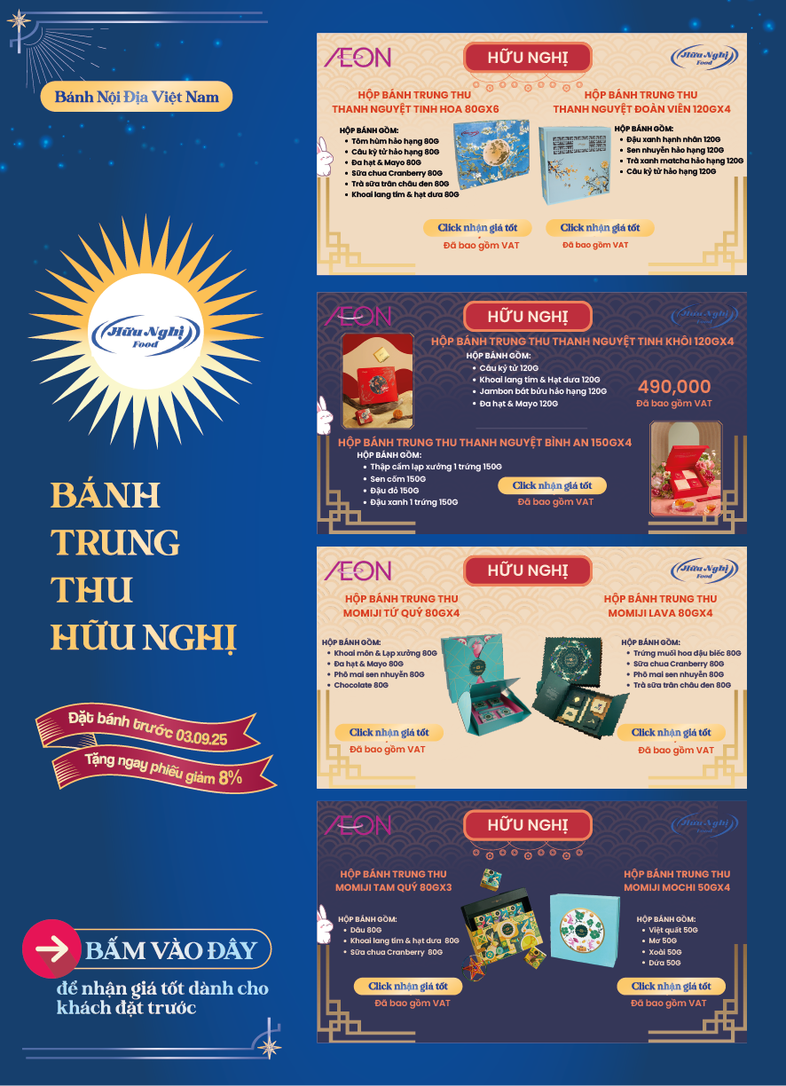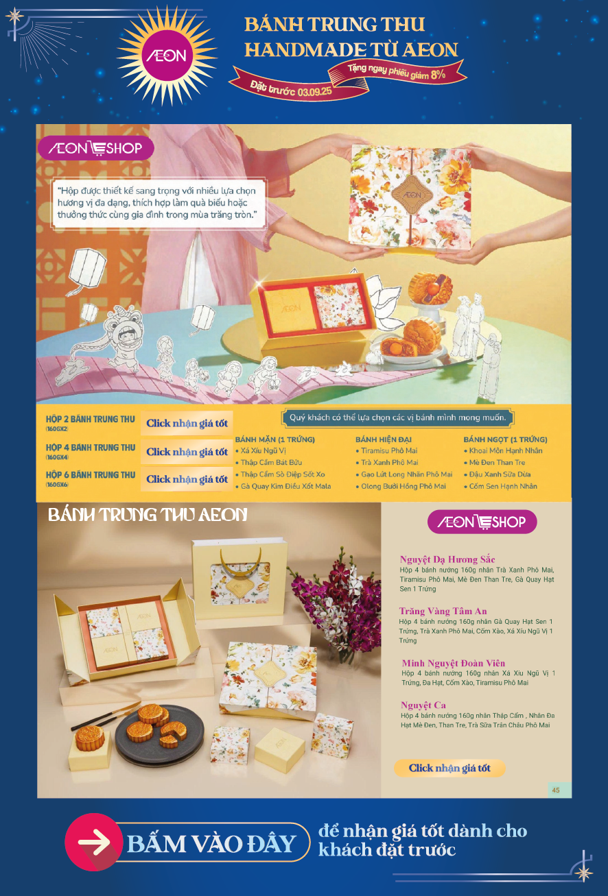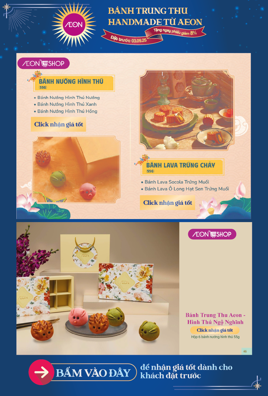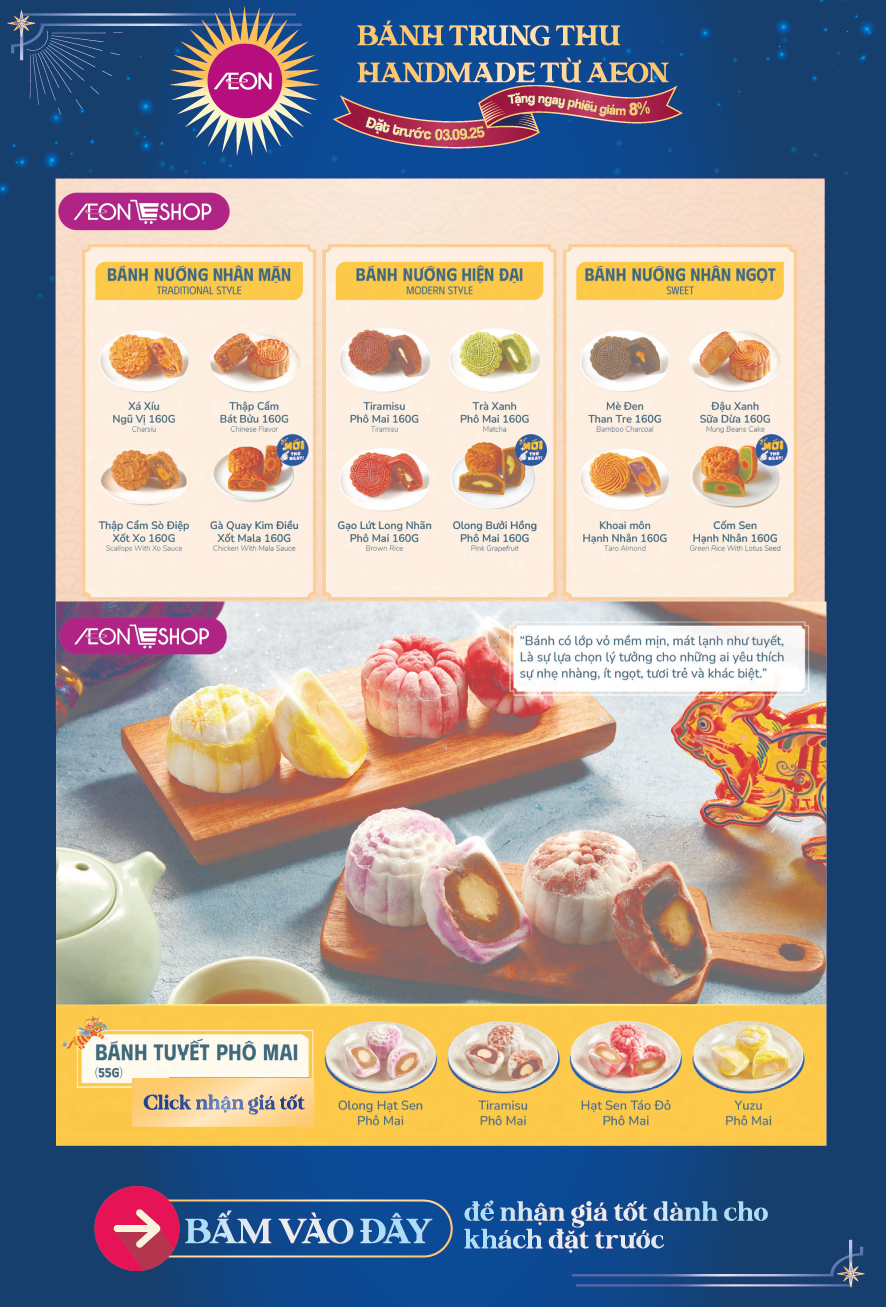 Tháng 8 trăng rằm, gửi gắm tâm tình qua những hộp bánh thơm ngon là nét đẹp văn hoá mỗi mùa Trung Thu. Và mỗi hộp quà là một lời chúc khác biệt, một sự trân trọng dành riêng dành cho những mối tâm giao. 🪐 Hiểu được điều đó, AEON mang đến cho quý khách hàng BST Bánh Trung Thu 2025 với nhiều lựa chọn hấp dẫn.