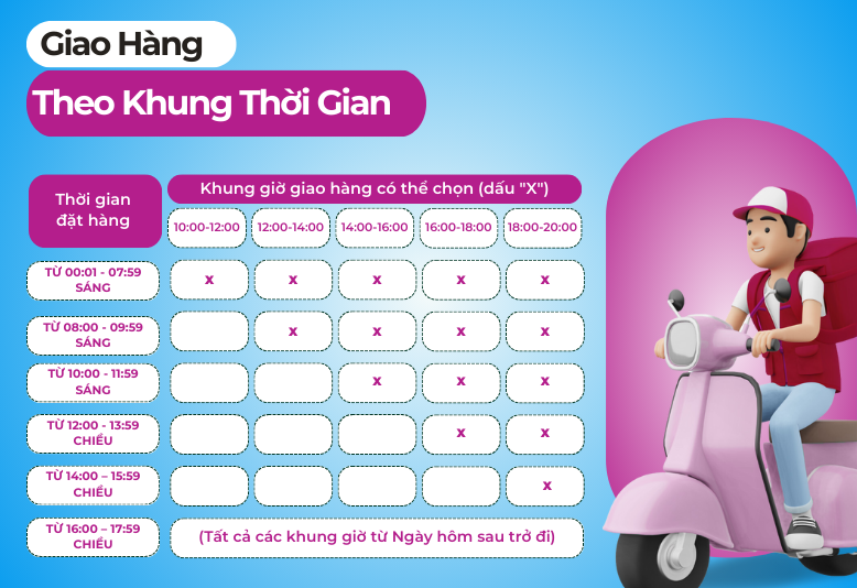 Sản phẩm áp dụng: Hàng tươi sống, đông lạnh, thực phẩm khô, thực phẩm chế biến sẵn, gia dụng, hóa mỹ phẩm, chăm sóc thú cưng, điện tử. <br>Thời gian giao hàng: Tùy vào thời điểm Khách Hàng đặt hàng và giới hạn về số lượng đơn hàng AeonEshop có thể cam kết giao theo khung giờ, Khách Hàng có thể chỉ định khung giờ giao hàng mong muốn và có thể chọn thời gian giao hàng cho đến 6 ngày tiếp theo kể từ thời điểm đặt hàng như sau.