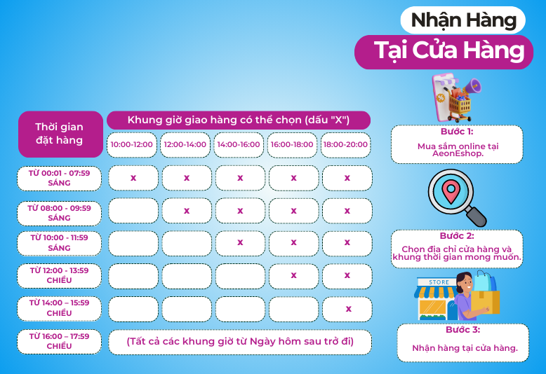 Nhận hàng tại cửa hàng - một dịch vụ tiện lợi từ AeonEshop khi bạn mua sắm trực tuyến bất cứ khi nào và nhận đơn hàng của bạn tại cửa hàng theo khung thời gian mong muốn của bạn. Sản phẩm áp dụng: Hàng tươi sống, đông lạnh, thực phẩm khô, thực phẩm chế biến sẵn, gia dụng, hóa mỹ phẩm, chăm sóc thú cưng, điện tử.