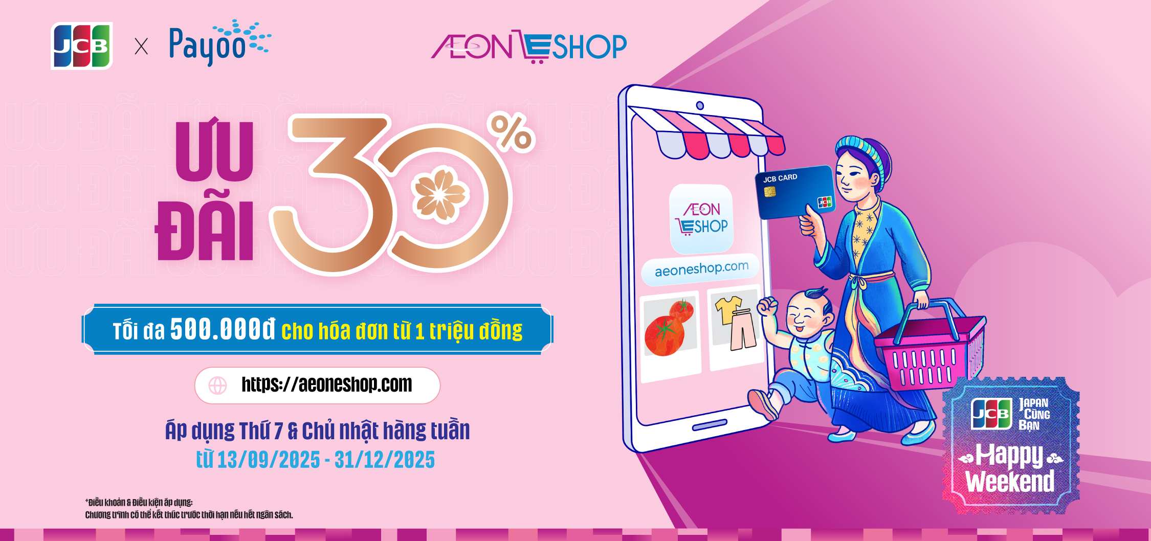 - Chương trình ưu đãi voucher Giảm 30% (Tối đa 500k) Cho Đơn Từ 1 Triệu dành cho chủ thẻ JCB khi mua sắm tại website/app AEONESHOP