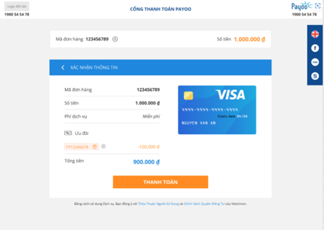 Khách hàng chọn hình thức tương ứng và cung cấp thông tin thẻ. Chương trình/mã voucher hợp lệ được tự động áp dụng khi số thẻ đạt đủ điều kiện hưởng chương trình, Cổng thanh toán Payoo tính số tiền thanh toán sau giảm giá. Khách hàng tiến hành xác nhận giao dịch thanh toán.